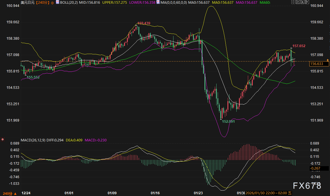 从美元兑日元240分钟图观察,当前价格156.585正处于布林带中轨(156.797)与下轨(156.284)之间。布林带通道宽度显示市场波动率处于温和状态,上轨位于157.310,下轨位于156.284。MACD指标中,DIFF线(0.325)位于DEA线(0.437)下方,柱状图为负值,暗示短期动能偏弱。
